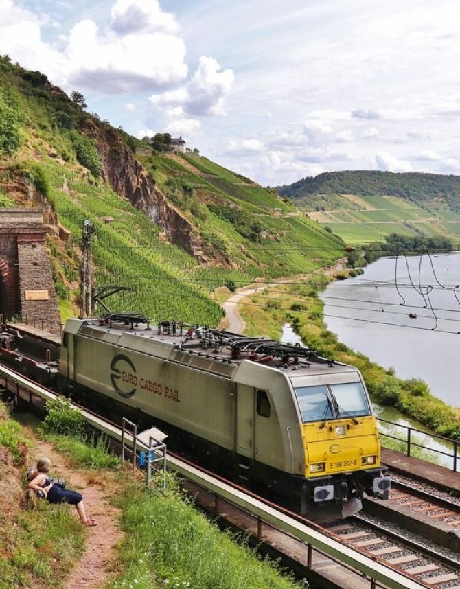 2023 rollt die ECR 186 302-8 am schönen Moselufer entlang. copyright: Joachim Bügel / Slg. Eisenbahnstiftung